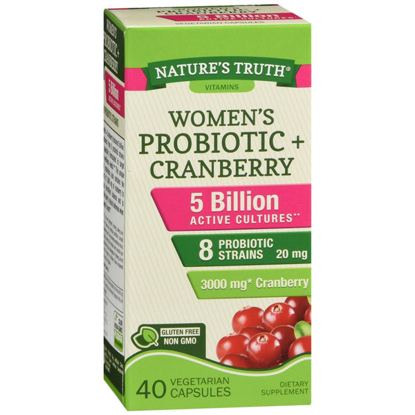 5 billion active cultures.** 8 probiotic strains (20 mg). 3000 mg* cranberry. Gluten free. Non-GMO. This is specially formulated to target women's wellness needs.** This unique blend of probiotics also contains the equivalent of 3000 mg of cranberry to encourage microflora balance and to support the body's natural defenses when women need it most.+* Probiotics are good bacteria naturally found in your digestive tract that support a healthy immune system.+ An easy addition to any routine.** This unique blend is specially designed to provide overall digestive health while targeting woman's wellness.+ Containing 5 billion active cultures per serving, this targeted women’s formula provides optimal support for the body's natural defenses.+** Targeted multi-strain formula: Each serving contains 8 strains of friendly bacteria to naturally support flora balance and digestive health.+ High potency 50:1 pure concentrate: Helps maintain healthy urinary tract health. +* No wheat, soy, artificial color, artificial flavor, artificial sweetener, preservatives. +These statements have not been evaluated by the Food and Drug Administration. This product is not intended to diagnose, treat, cure or prevent any disease. **Nature's Truth Women's Probiotic + Cranberry contains 5 billion active cultures per serving (including the naturally occurring metabolic product produced by Lactobacilli) at the time of manufacture.