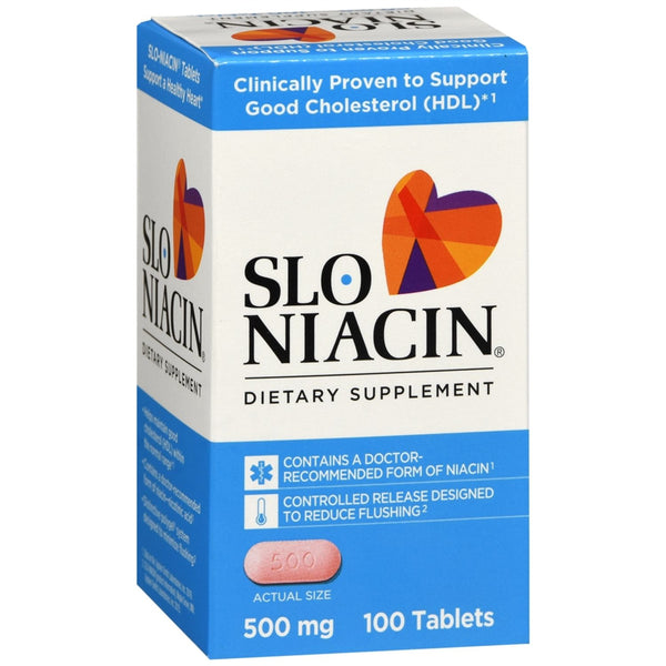 Niacin may cause temporary flushing, itching and tingling, feelings of warmth and headache, particularly when beginning, increasing amount or changing brand of niacin. These effects seldom require discontinuing niacin use. Skin rash, upset stomach, and low blood pressure when standing are less common symptoms; if they persist, contact a physician. SLO-NIACIN Tablets should not be used by persons with a known sensitivity or allergy to niacin. Persons with heart disease, particularly those who have recurrent chest pain (angina) or who recently suffered a heart attack, should take niacin only under the supervision of a physician. Persons taking high blood pressure or cholesterol-lowering drugs should contact a physician before taking niacin because of possible interactions. Case reports of myopathy (unexplained muscle related complaints, including discomfort, weakness, or tenderness) have been documented with the use of HMG-CoA Reductase Inhibitors in combination with lipid-altering doses of niacin therapy (> or = to 1 gram of niacin per day). Do not take niacin unless recommended by and taken under the supervision of a physician if you have any of the following conditions: gallbladder disease, gout, arterial bleeding, glaucoma, diabetes, impaired liver function, peptic ulcer, pregnancy or lactating women. Increased uric acid and glucose levels and abnormal liver function tests have been reported in persons taking daily doses of 500 mg or more of niacin. Discontinue use and consult a physician immediately if any of the following symptoms occur: persistent flu-like symptoms (nausea, vomiting, a general 'not well' feeling); loss of appetite; a decrease in urine output associated with dark-colored urine; muscle discomfort such as tender, swollen muscles or muscle weakness; irregular heartbeat; or cloudy or blurry vision. Keep out of reach of children.