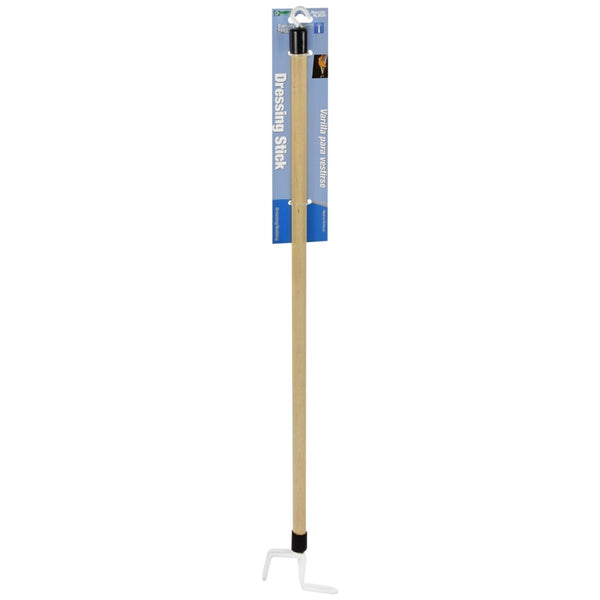 Plastic coated push/pull hook to aid in dressing. Lightweight wooden handle. 27 inches long. Plastic coated C hook for zippers.
