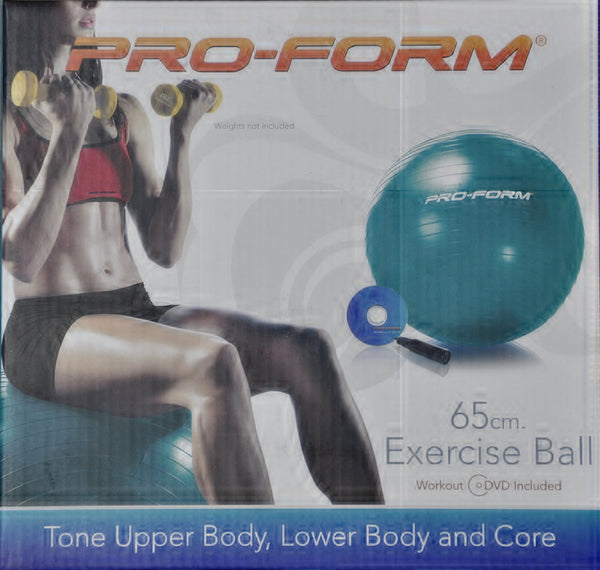 Pro-Form PFFB6510 65cm Exercise Ball is ideal for Toning, Strengthening and increasing flexibility. Includes Workout DVD and dual-action hand pump. 65 cm Exercise Ball Latex Free 250 lb. Max weight capacity, ideal for heights 5'3" - 5'11". Tone Lower Body, Upper Body & Core. Workout DVD and hand pump included