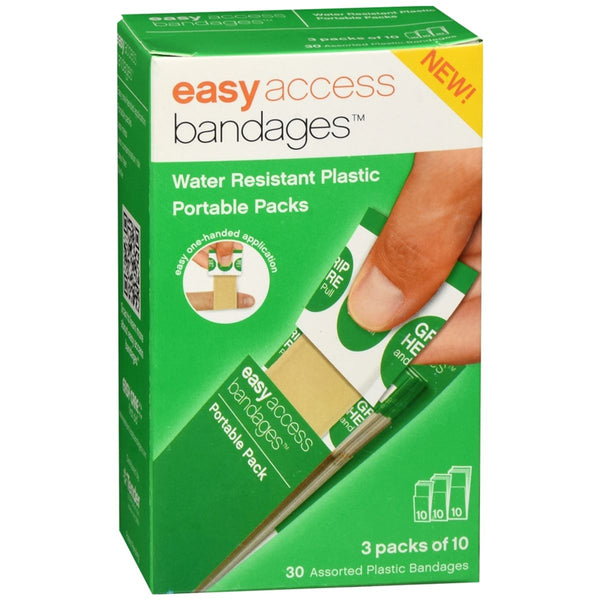 Easy Access Bandages - Water Resistant Plastic Portable Packs Assorted Sizes - 30 EA