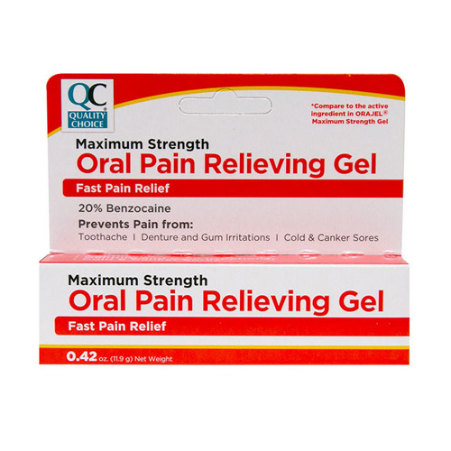 Quality Choice Maximum Strength Oral Pain Relieving Gel, 20% Benzocaine, .42 fl oz. 20% Benzocaine. Fast pain relief. Maximum strength. Prevents pain from toothache, denture and gum irritations, cold & canker sores. Oral pain reliving gel