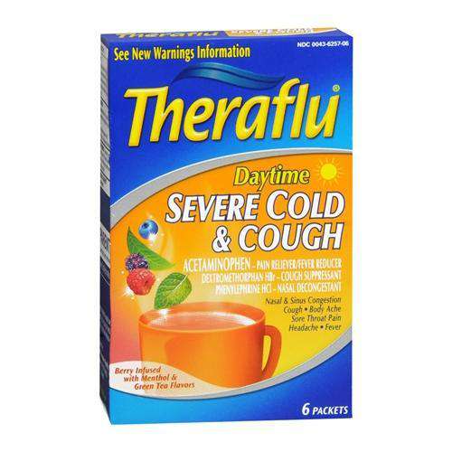 Liver warning: This product contains acetaminophen. Severe liver damage may occur if you take: more than 6 packets in 24 hours, which is the maximum daily amount; with other drugs containing acetaminophen; 3 or more alcoholic drinks every day while using this product. Sore throat warning: If sore throat is severe, persists for more than 2 days, is accompanied or followed by fever, headache, rash, nausea, or vomiting consult a doctor promptly. Do not use: in a child under 4 years of age; if you are allergic to acetaminophen; with any other drug containing acetaminophen (prescription or nonprescription). If you are not sure whether a drug contains acetaminophen, ask a doctor or pharmacist; if you are now taking a prescription monoamine oxidase inhibitor (MAOI) (certain drugs for depression, psychiatric, or emotional conditions, or Parkinson's disease), or for 2 weeks after stopping the MAOI drug. If you do not know if your prescription drug contains an MAOI, ask a doctor or pharmacist before taking this product. Ask a doctor before use if you have: liver disease; heart disease; high blood pressure; thyroid disease; diabetes; trouble urinating due to an enlarged prostate gland; cough that occurs with too much phlegm (mucus); cough that lasts or is chronic such as occurs with smoking, asthma or emphysema. Ask a doctor or pharmacist before use if you are: taking the blood thinning drug warfarin. When using this product: do not exceed recommended dosage. Stop use and ask a doctor if: nervousness, dizziness, or sleeplessness occurs; fever gets worse or lasts more than 3 days; redness or swelling is present; new symptoms occur; symptoms do not get better or worsen; pain, cough or nasal congestion gets worse or lasts more than 7 days; cough comes back or occurs with fever, rash or headache that lasts. These could be signs of a serious condition. If pregnant or breast-feeding, ask a health care professional before use. Keep out of reach of children. In case of overdose, get medical help or contact a Poison Control Center right away. Prompt medical attention is critical for adult as well as for children even if you do not notice any signs or symptoms. Phenylketonurics: contains phenylalanine 14 mg per packet.