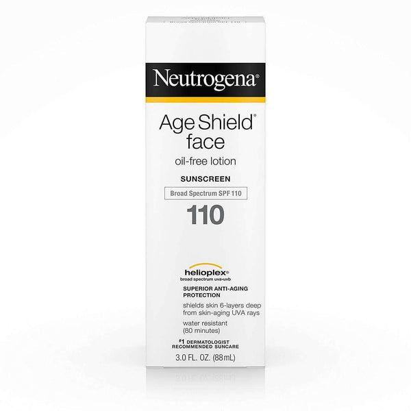 Help keep your skin protected from damaging UV rays with Neutrogena Age Shield Face Lotion Sunscreen with Broad Spectrum SPF 110. Helioplex, a sunscreen technology with Broad Spectrum UVA/UVB protection, shields skin six-layers deep from the sun’s damaging rays. Our anti-aging sunscreen blocks UVB burning rays and helps stop UVA aging rays from penetrating surface layers for deep cellular protection. This dermatologist-tested moisturizing sunscreen also contains skin conditioners to hydrate and replenish skin. When used as directed with other sun protection measures, our face sunscreen can help decrease the risk of skin cancer and early skin aging caused by the sun. From the #1 dermatologist-recommended suncare brand, its unique formula is PABA- and oil-free as well as non-comedogenic so it won’t clog pores.