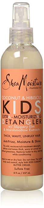 SheaMoisture's Coconut ; Hibiscus Kids Extra-Moisturizing Detangler detangles, defines and tames children's thick, wavy or unruly hair without greasiness. Conditions while restoring luster to dry, dull hair. Made with natural and certified organic ingredients. Shea Moisture Kid's Detangler, Coconut & Hibiscus, 8 Oz