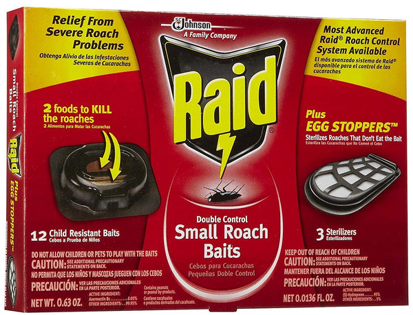 Kills Roaches for 3 months. Relief from severe roach problems. Child Resistant Baits. Two foods to kill the roaches. Reduces roach population within days. Raid Double Control 12 Small Roach Baits + 3 Egg Stoppers 1 ea