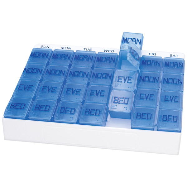 Features seven removable four-a-day pill organizers in an easy snap tray. Fill a one week medication regimen at one time, with the ability to take one four-a-day pack with you.