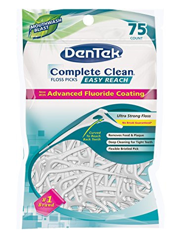 DenTek complete clean easy reach floss picks are clinically proven to remove plaque as effectively as dental floss. The unique Y-shape pick with angled floss head easily reaches back teeth to remove food, remove plaque, reduce tooth decay and to fight bad breath. Their flexible bristled pick brushes deep between teeth for a complete clean. Super-strong scrubbing floss is assured not to break, even when used on the tightest teeth. Mouthwash Blast flavor leaves the mouth feeling fresh. Now with Advanced Fluoride Coating. 75-Count per pack.