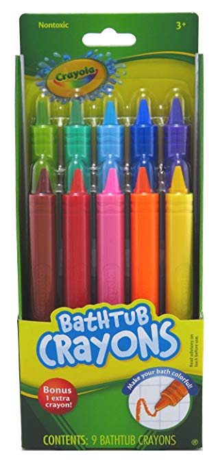 Crayola Bathtub Crayons, Assorted Colors 9 ea. Play Visions offers a new and unique line of Crayola-branded bath products. Kids can create their own are masterpieces on tile or tub walls-everything washes off quickly with water. Great colors, great packaging. Hard plastic cases contain retractable Crayola bathtub crayons. Contains 9 bright crayons. Create masterpieces on your bathtub wall! Hard plastic cases contain retractable Crayola bathtub crayons. Recommended for ages 3 years and up. Easy to clean and non-toxic. Colors include: leprechaun green, firefly red, little boy blue, copper penny orange, inch worm green, vivid purple, cotton candy pink, jungle green, laser lemon yellow. Bonus One extra crayon!