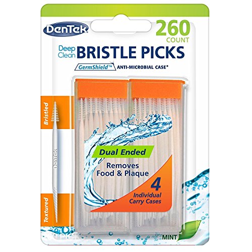 DenTek deep clean dual ended bristle picks will give your teeth the deep clean needed after meals. Its Mint flavor and dual-ended sides will scrub away plaque and food that cause bad breath. Each pack comes with 260-Count picks and 4 individual anti-microbial carrying cases that easily fits in pocket or purse. Using bristle picks regularly will reduce tooth decay.