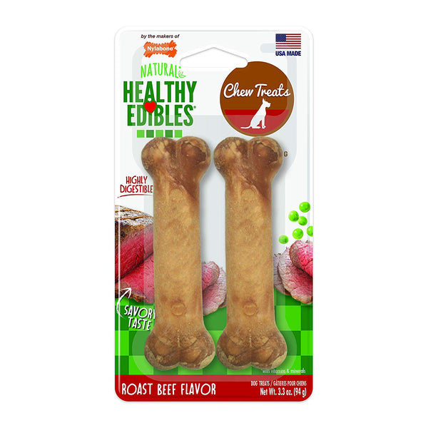 Nylabone Healthy Edibles Roast Beef natural dog chews are a healthy and wholesome treat with a hearty roast beef flavor that dogs love. Crafted with your dog's wellness in mind, these healthy dog treats are made with natural ingredients and added vitamins and minerals—with no added salt, sugar, or artificial preservatives. The longer-lasting, highly digestible formula is the perfect way to occupy and satisfy your best friend. For dogs with all their permanent teeth (usually six months and older).