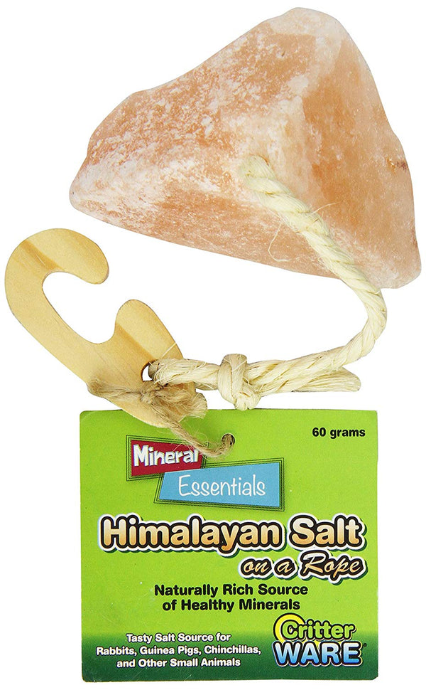 This himalayan salt on a rope is a naturally rich source of healthy minerals for small pets on a totally edible seagrass and wood holder. Natural salt from an ancient sea bed provides a safe and wholesome source of natural minerals. Measures 3-inch width by 1-1/2-inch depth by 6-inch height.
