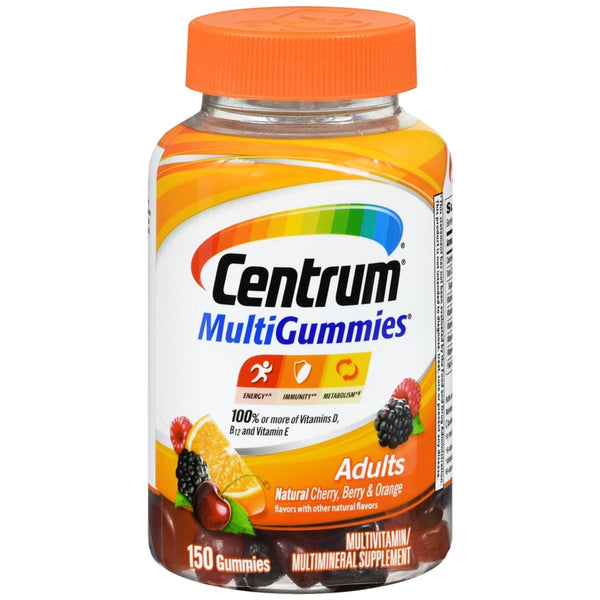 Centrum MultiGummies Multivitamin/Multimineral Supplement:ulSupports energy, immunity and metabolismB vitamins support daily energy needsAntioxidant vitamins C, E and zinc support normal immune functionB vitamins aid in the metabolism of fats, carbohydrates and proteins100% or more of vitamins D, B12 and ENo artificial flavors or sweetenersGluten free/ul. The picture is for illustrated purposes, we should have the latest version of the product in stock.