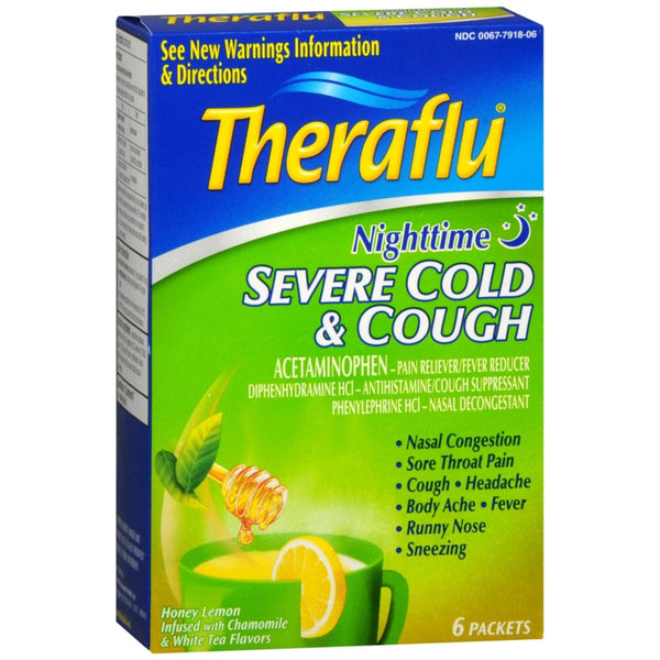 Theraflu - Nighttime Severe Cold & Cough Packets Honey Lemon Infused with Chamomile & White Tea Flavors - 6 EA