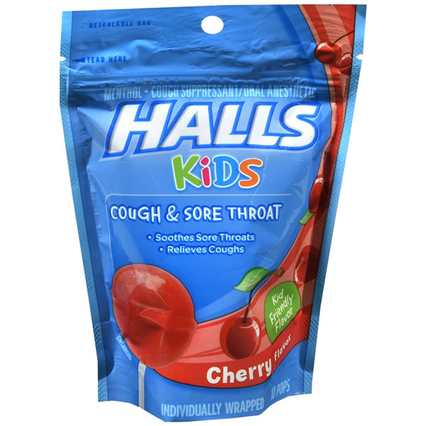 HALLS Kids Pops are formulated to bring classic Halls relief in new kid friendly flavors. HALLS fights coughs, soothes sore throats, and cools nasal passages. Fast-acting relief is great year round- cold season to allergy season. Your child will enjoy this classic cough suppressant in tangy Cherry flavor. This package includes 10 pops in a flavor-saving resealable bag.